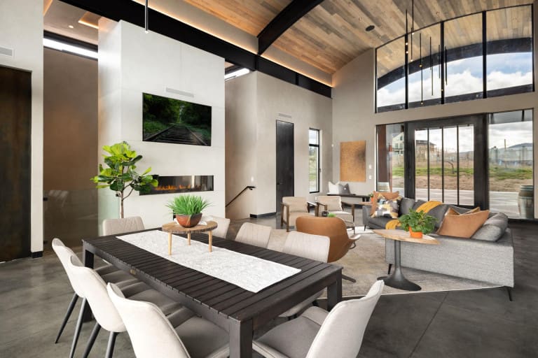 The massive pivot entry door opens into the great room with 22’ high ceilings is emphasized by the tall, black oxidized steel doors throughout the interior.